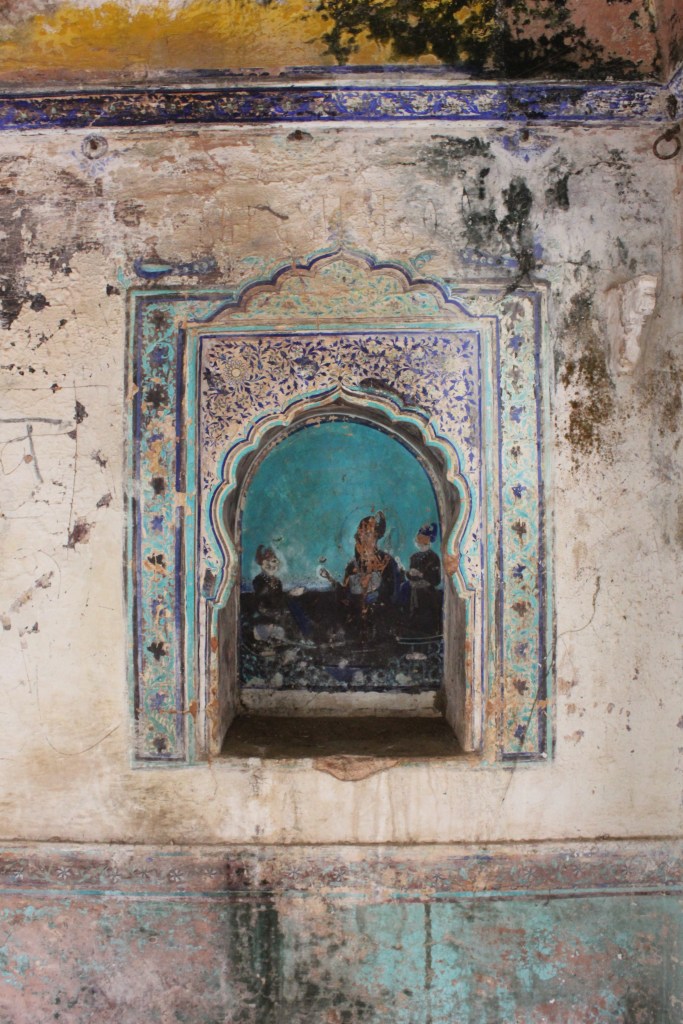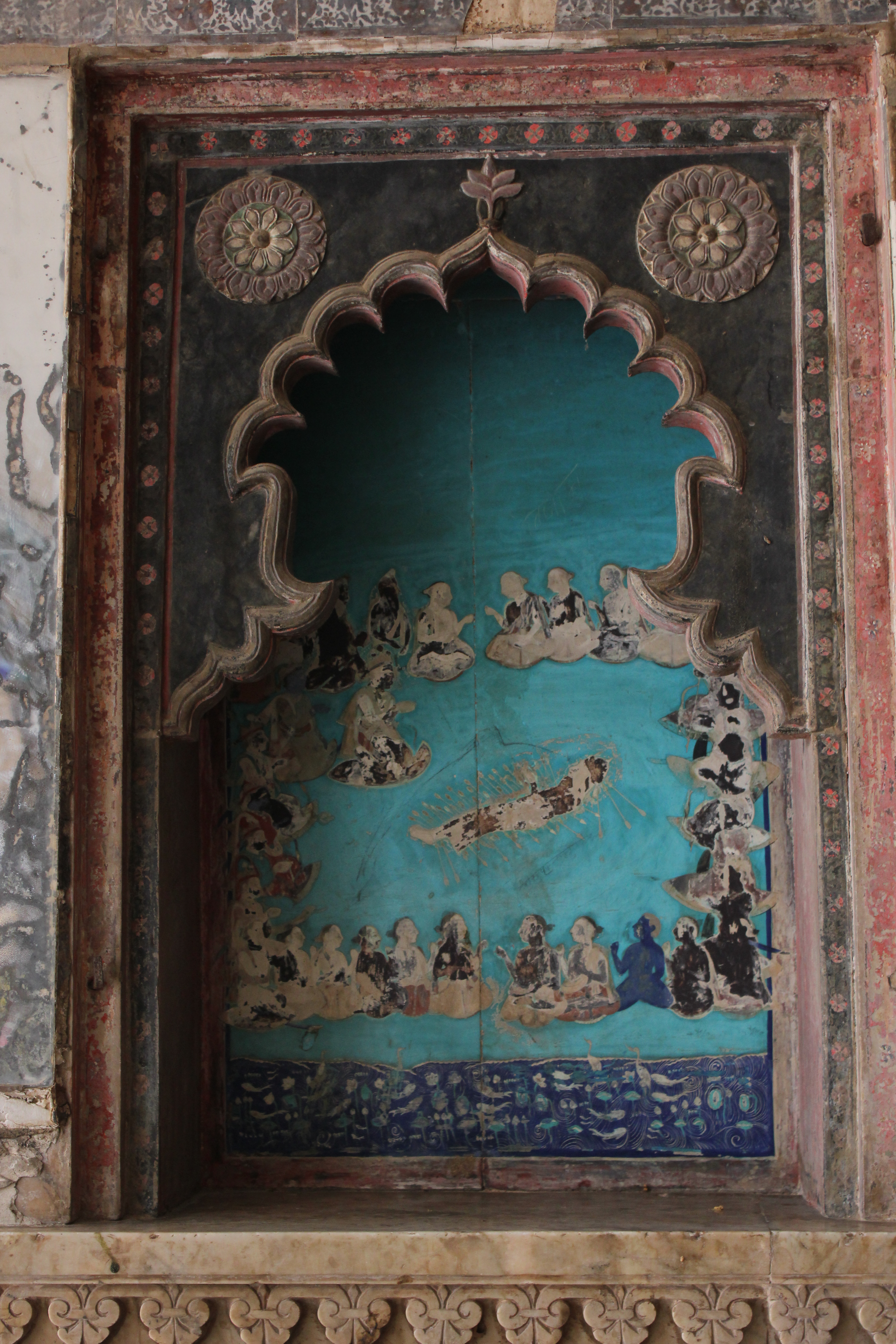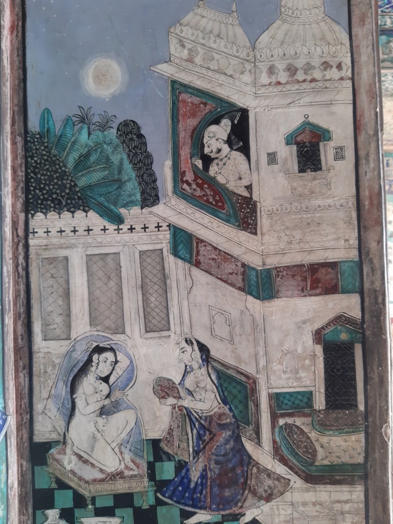We were welcomed by a brightly coloured decorative indigo ceiling. As we went inside, there were dressing rooms and bedrooms, enveloped in paintings and music. These paintings are called Ragamalas. They are unique, because they portray Indian ragas and music through visuals and colour. Imagine depicting a tune that embodies a certain mood through the form of painting.