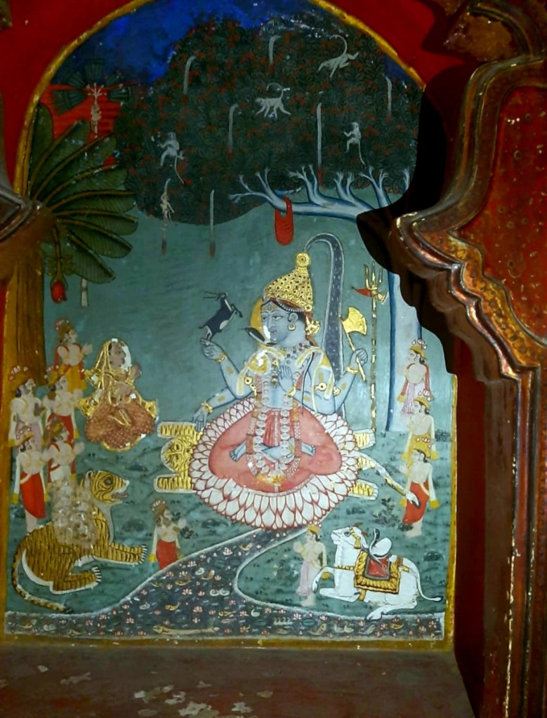 The painting above depicts raag Bhairava, through the portrayal of lord Shiva. Raag Bhairava was born of the mouth of Shiva, and has the notes of Dha, Ni, Sa, Ga, Ma. it is to be sung in the morning on an autumn day. The colours and elements of nature capture this autumnal ambience and the mood of the Raga. Turqoise was commonly used to depict it. Also, the yellow areas in the paintings in this chamber were gold plated.